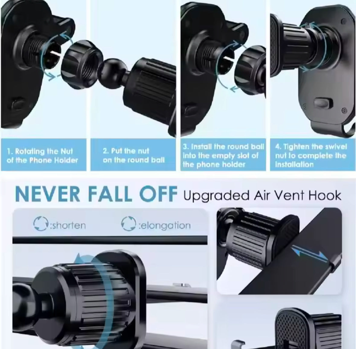Installation is quick and simple — no tools required. Made from high-quality, durable materials, this phone holder is built to last and withstand daily use. Its compact design fits discreetly in your car’s air vent without blocking airflow or visibility, keeping your dashboard clutter-free.