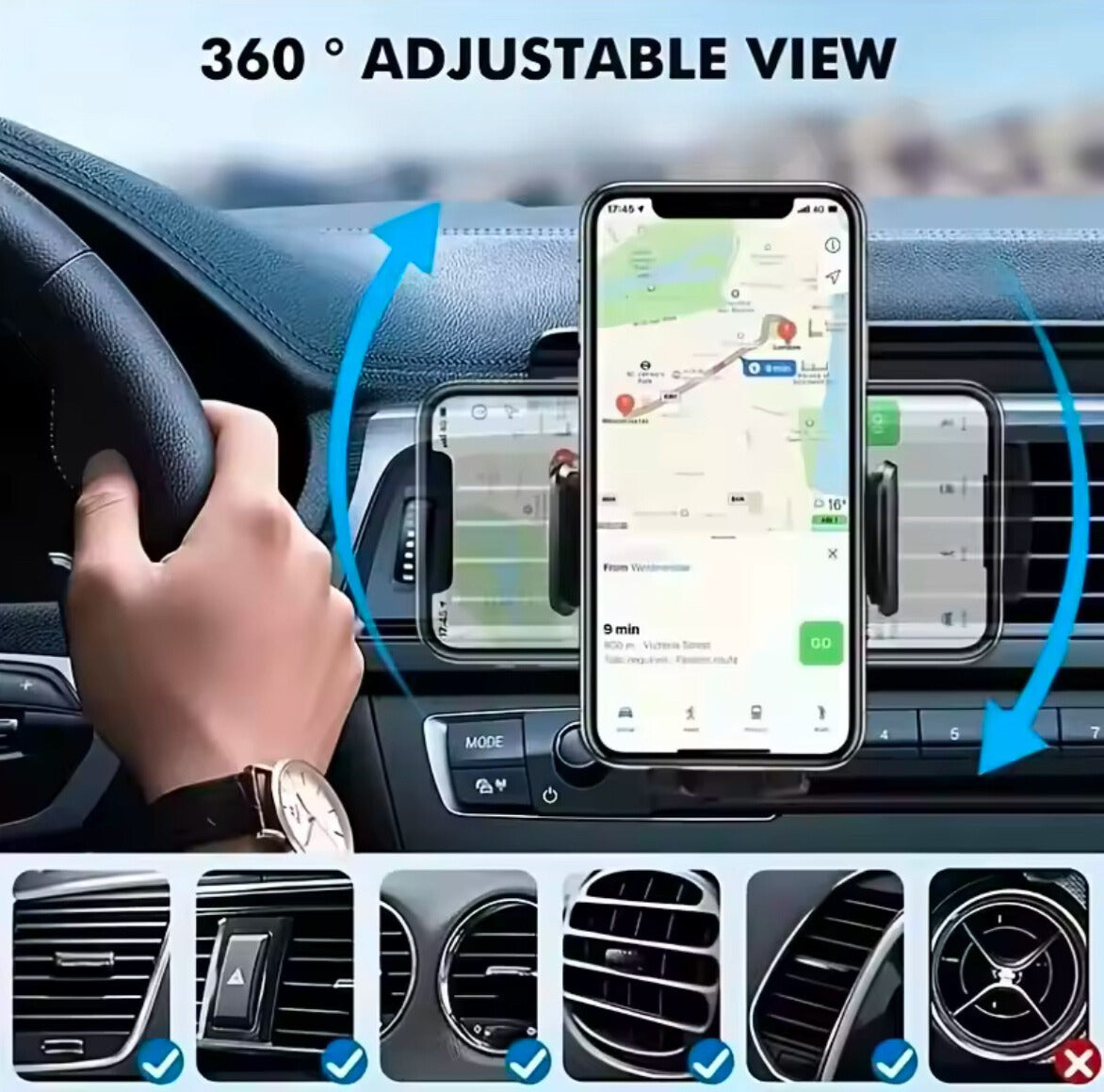 Keep your smartphone secure and easily accessible while driving with this air-vent mounted phone holder. Designed to fit most phones between 55mm and 85mm, it provides a stable and reliable grip that prevents slipping or shaking, even on bumpy roads. The 360° rotating design allows you to adjust your phone to the perfect viewing angle, making navigation, calls, and music control effortless and safe.